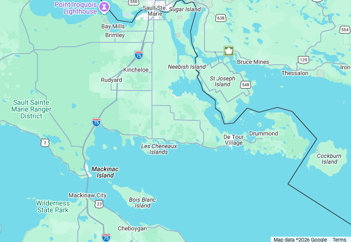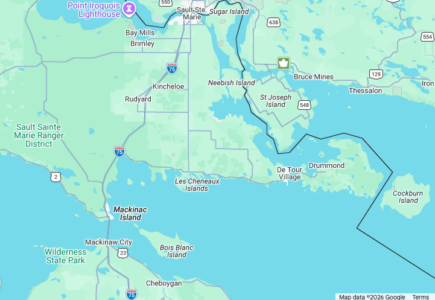 - Drummond Island, Mich. and St. Joseph Island, Ont. — both located in Lake Huron near the easternmost end of the Upper Peninsula — are now connected by an ice bridge open to international travel. (Google Maps image)