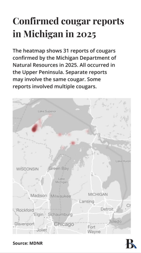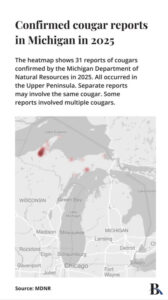 And, while there were 31 confirmed reports of cougars in Michigan last year, some of which involved multiple cougars — which is why the DNR’s data counts 34 sightings for 2025 — that doesn’t mean there were 30-plus cougars in the state.