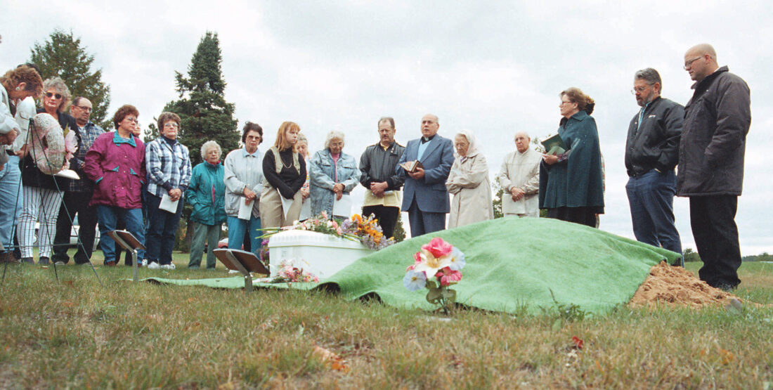 About 40 people attended the memorial in June 1997 at Maplewood Cemetery in Hudson Township for Baby Garnet, a newborn infant found at the bottom of a campground outhouse. (Photo courtesy of The Mining Journal, Marquette)