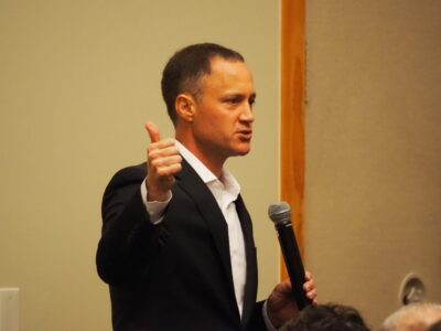 Republican gubernatorial candidate Tom Leonard speaks to a crowd of GOP party fixtures at a dinner honoring the late state Sen. George McManus at Great Wolf Lodge in Traverse City, Mich. Aug. 8, 2025 (Photo by Ben Solis/Michigan Advance)