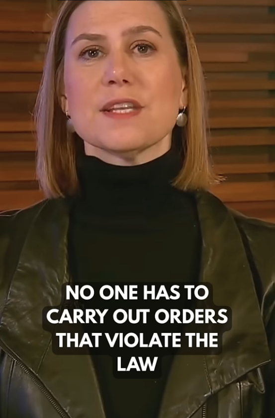 A still, featuring Michigan Senator Elissa Slotkin and caption, is shown from the video released in November 2025 urging military members not to follow "illegal" orders. Slotkin, formerly a CIA officer, appeared alongside Sen. Mark Kelly of Arizona, former Navy captain; Rep. Chris DeLuzio of Pennsylvania, former Navy officer; Rep. Maggie Goodlander of New Hampshire, former intelligence officer; Rep. Chrissy Houlahan of Pennsylvania, former Air Force officer; and Rep. Jason Crow of Colorado, former Army ranger and paratrooper.