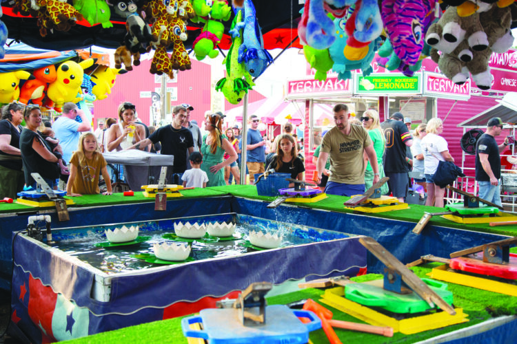 A man shows off his "Hammer Strength" at the frog jump game during the U.P. State Fair. The game, which challenges players to catapult rubber frogs onto lily pads using a mallet, is a perennial favorite at the fair.