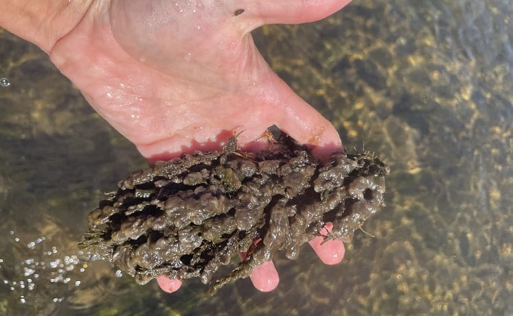 A person holds didymo, an invasive species in Michigan lakes. Didymo "Looks and feels like white or brown wet wool and ranges from small, cotton ball-sized patches to thick blankets and long, rope-like strings that flow in currents." (Michigan DNR)