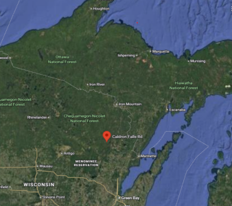 Shown in relation to the western Upper Peninsula is the location where a fatal side-by-side crash happened on Saturday in Stephenson, Marinette County, Wis. (Google Maps screenshot by R. R. Branstrom)
