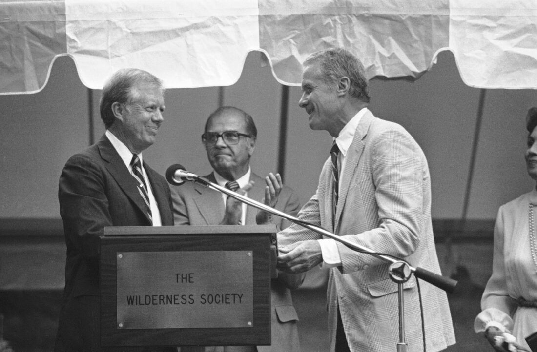 - Former President Jimmy Carter, left, is honored by Wilderness Society President Harold Jerry Jr. of Albany, N.Y., right, in Atlanta on Aug. 20, 1982. Former Sen. Gaylord Nelson of Wisconsin — the founder of Earth Day — applauds at center. Carter received the Ansel Adams Award from the society for his conservation efforts. (AP Photo/Charles Kelly)