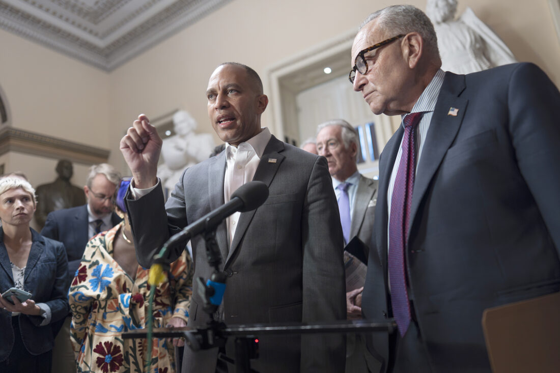 House Minority Leader Hakeem Jeffries, D-N.Y., left, and Senate Minority Leader Chuck Schumer, D-N.Y., speak to reporters Sept. 11 at the Capitol in Washington. (AP Photo/J. Scott Applewhite)