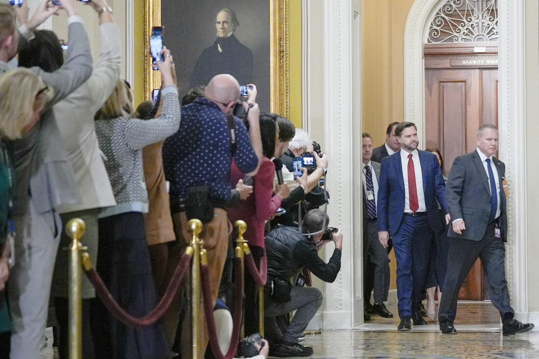 Vice President JD Vance, center, arrives Tuesday for a Senate Republican Conference luncheon at the U.S. Capitol on day 28 of the government shutdown in Washington. (AP Photo/Mariam Zuhaib)
