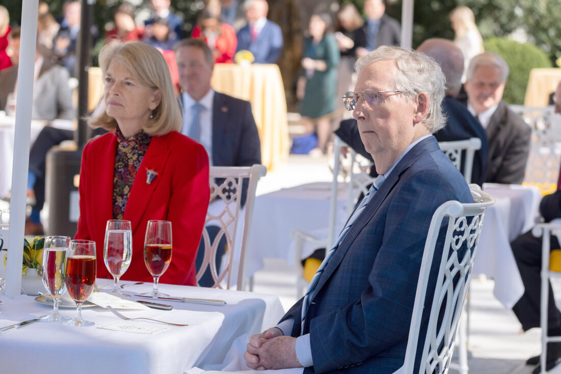 Sen. Mitch McConnell, R-Ky., and Sen. Lisa Murkowski, R-Alaska, at a lunch Tuesday hosted by President Donald Trump on the Rose Garden patio at the White House, Tuesday in Washington. (AP Photo/Manuel Balce Ceneta)