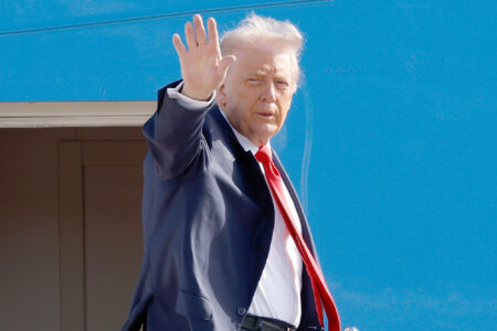 President Donald Trump waves from the stairs of Air Force One as he boards upon his arrival at Joint Base Andrews, Md., on Friday en route to his Mar-a-Lago estate in Palm Beach, Fla. (AP Photo/Luis M. Alvarez)