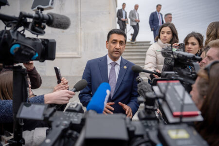 Rep. Ro Khanna, D-Calif., speaks to reporters Tuesday on the steps of the U.S. Capitol after voting in favor of the Epstein Files Transparency Act in Washington. (AP Photo/Julia Demaree Nikhinson)