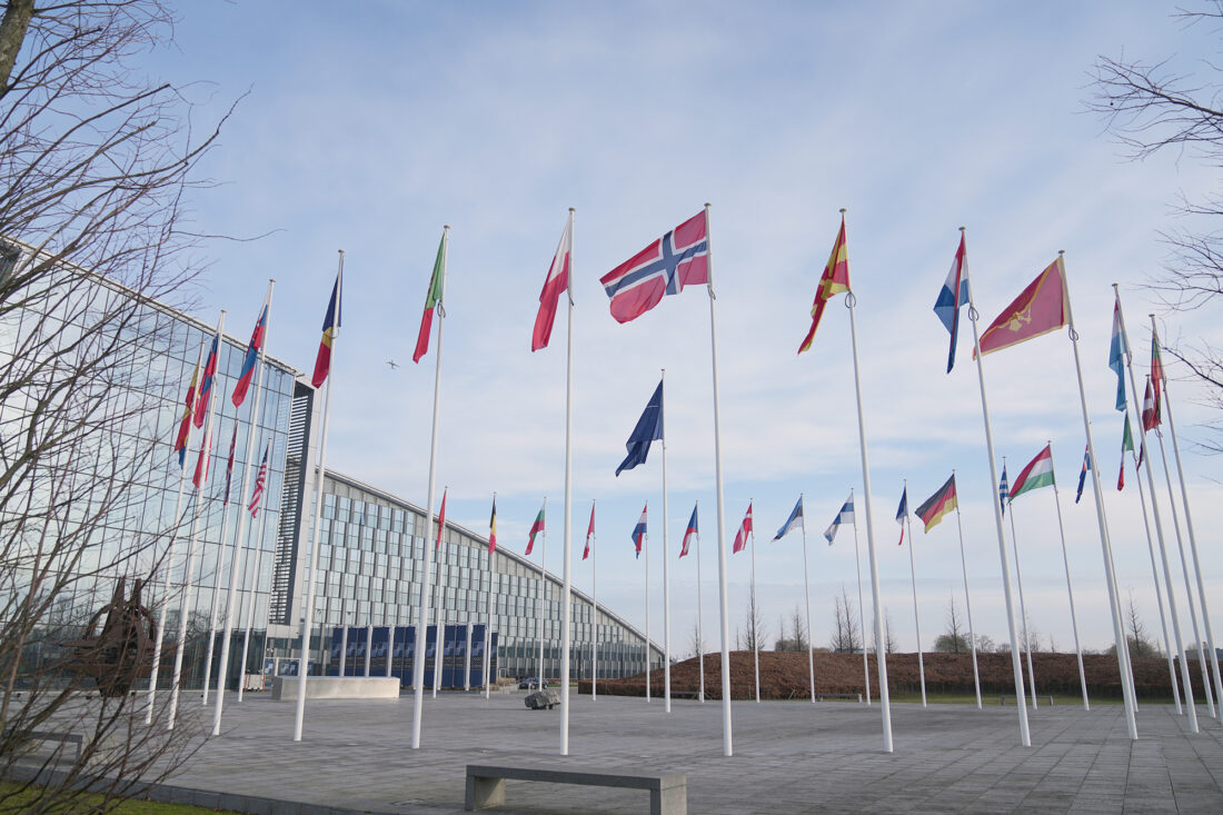 Flags flap in the wind outside NATO headquarters in Brussels. (AP Photo/Virginia Mayo)