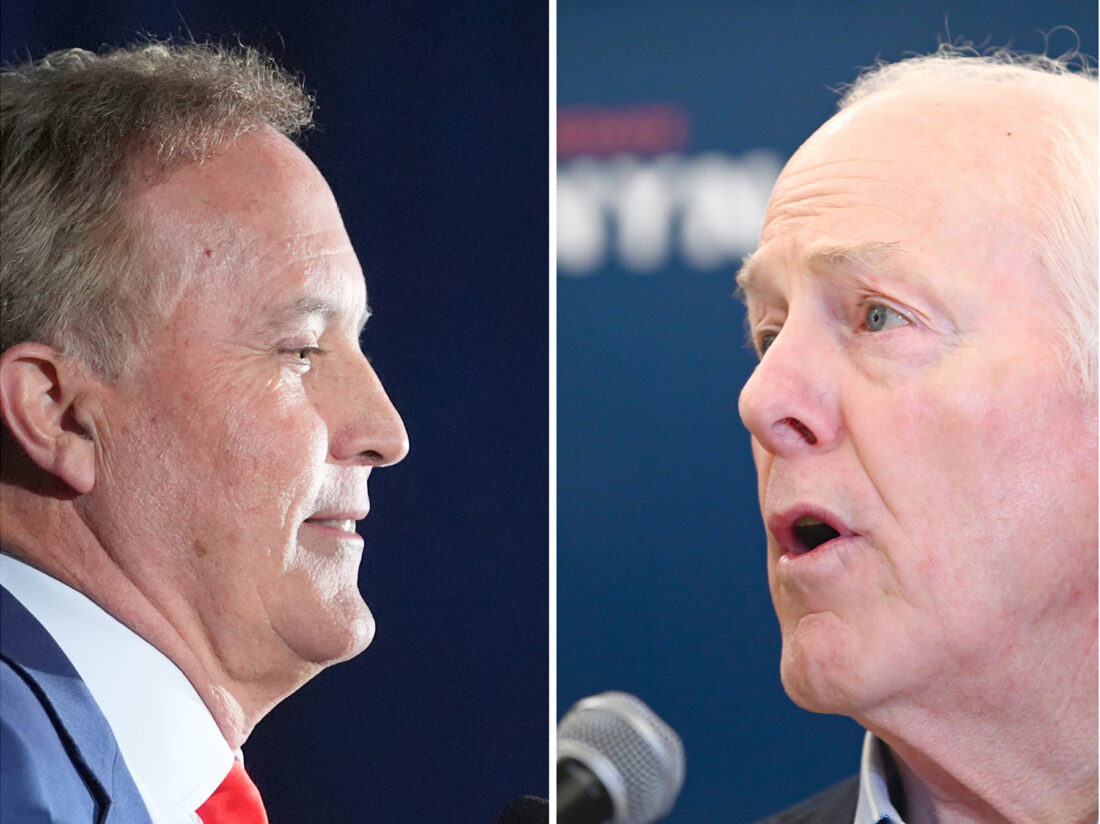 Texas Attorney General Ken Paxton, left, in Dallas, and Sen. John Cornyn, R-Texas, in Austin, Texas, both on Tuesday. (AP Photo/Julio Cortez, Jack Myer)