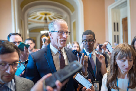 Senate Majority Leader John Thune, R-S.D., is met by reporters after a closed-door meeting March 26 with fellow Republicans on the Homeland Security budget stalemate, at the Capitol in Washington. (AP Photo/J. Scott Applewhite)
