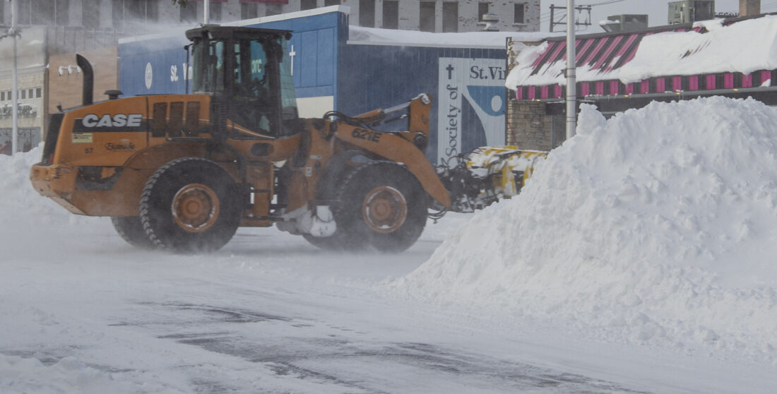 - During road cleanup efforts, a City of Escanaba loader crosses Ludington Street at 10th Street after a snowstorm in late December. (Daily Press file photo)