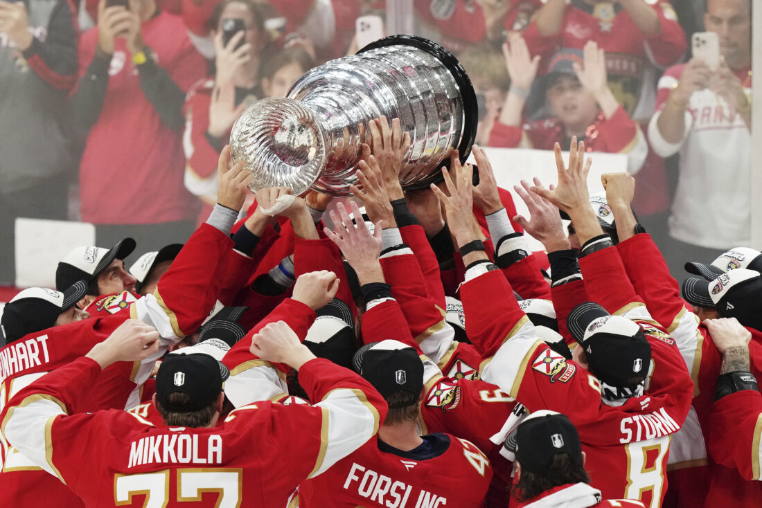 The Florida Panthers raise the Stanley Cup after defeating the Edmonton Oilers in Game 6 of the NHL hockey Stanley Cup Final in Sunrise, Fla., Tuesday, June 17, 2025. (Nathan Denette/The Canadian Press via AP)