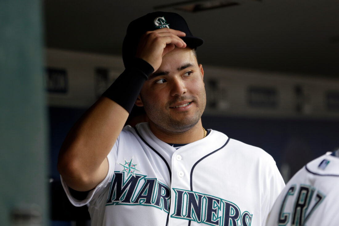 FILE - Seattle Mariners' Jesus Montero stands in the dugout before a baseball game, Aug. 10, 2015, in Seattle. (AP Photo/Elaine Thompson, file)