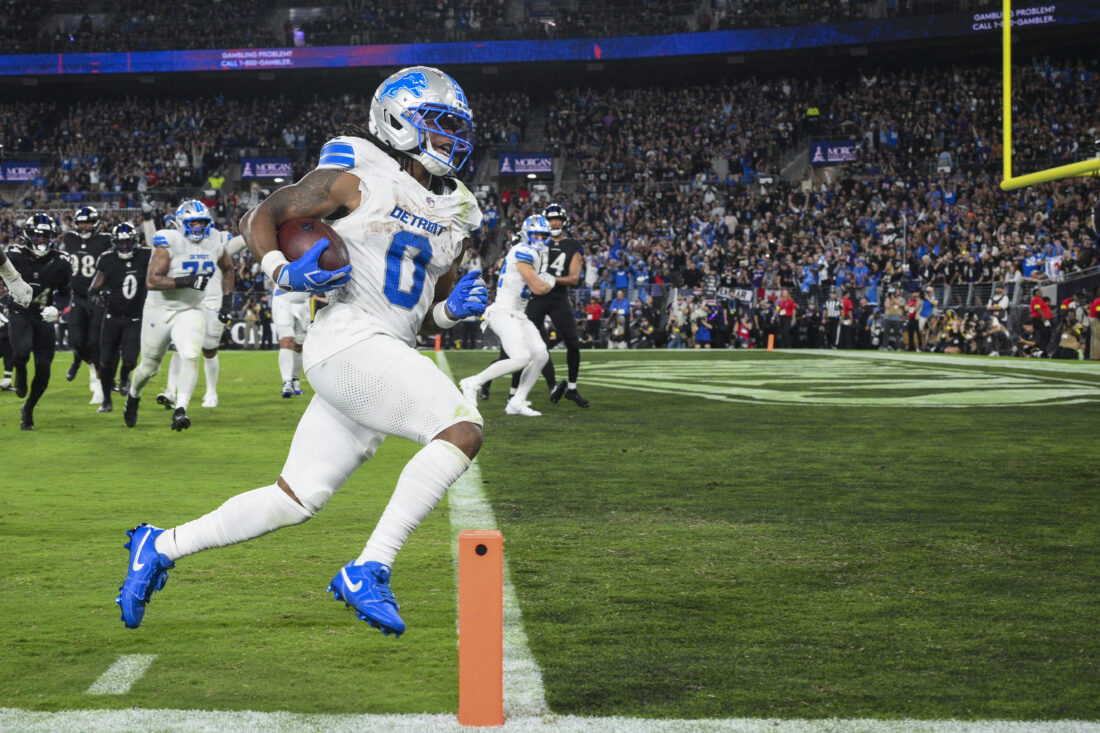 Detroit Lions running back Jahmyr Gibbs scores on a run against the Baltimore Ravens during the second half of an NFL football game Monday, Sept. 22, 2025, in Baltimore. (AP Photo/Nick Wass)