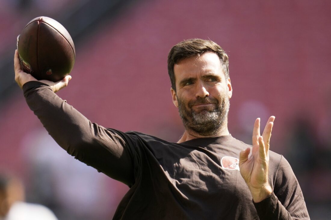 Cleveland Browns' Joe Flacco warms up before an NFL football game against the Green Bay Packers Sunday, Sept. 21, 2025, in Cleveland. (AP Photo/Sue Ogrocki)