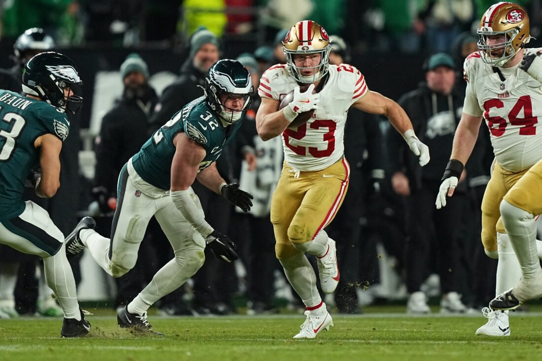 San Francisco 49ers running back Christian McCaffrey (23) runs the ball as Philadelphia Eagles safety Reed Blankenship (32) tries to stop him during the second half of an NFL wild-card playoff football game Sunday, Jan. 11, 2026, in Philadelphia. (AP Photo/Matt Rourke)