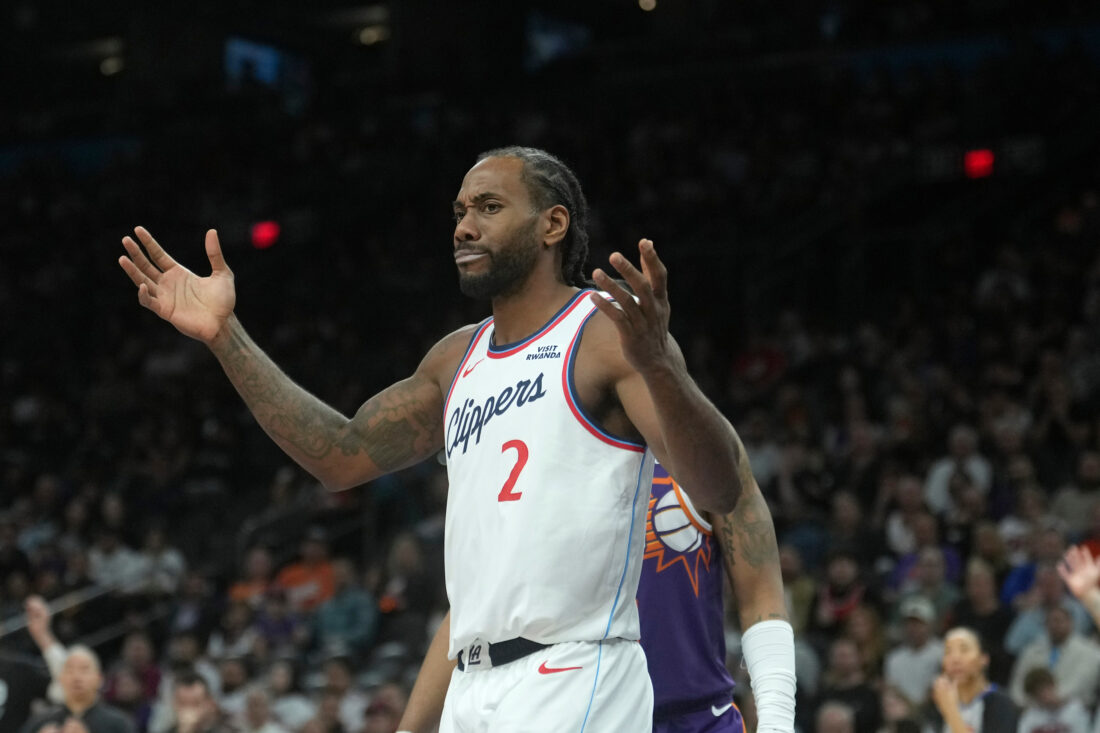 Los Angeles Clippers forward Kawhi Leonard looks for a foul to be called by officials during the second half of an NBA basketball game against the Phoenix Suns Sunday, Feb. 1, 2026, in Phoenix. (AP Photo/Ross D. Franklin)