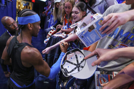 Oklahoma City Thunder guard Shai Gilgeous-Alexander, bottom left, gives autographs to fans before Game 1 of a first-round NBA playoffs basketball series against the Phoenix Suns, Sunday, April 19, 2026, in Oklahoma City. (AP Photo/Nate Billings)