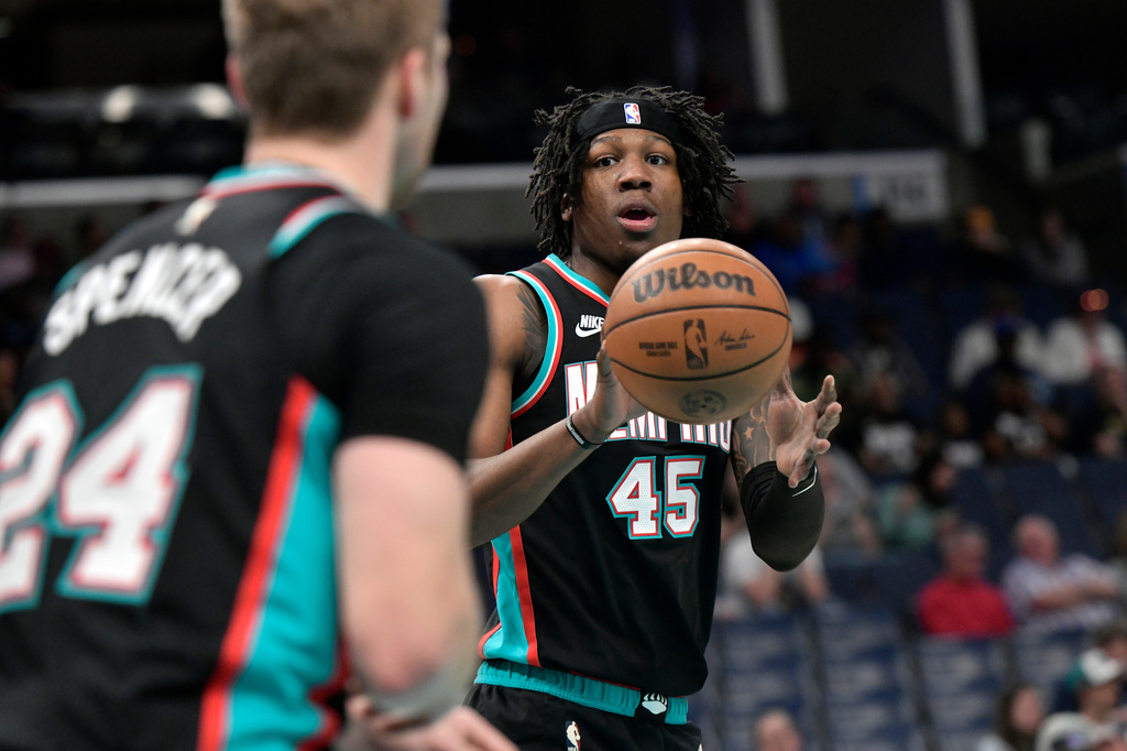 Memphis Grizzlies guard Cam Spencer (24) passes to forward GG Jackson II (45) in the first half of an NBA basketball game against the Cleveland Cavaliers, Monday, April 6, 2026, in Memphis, Tenn. (AP Photo/Brandon Dill)