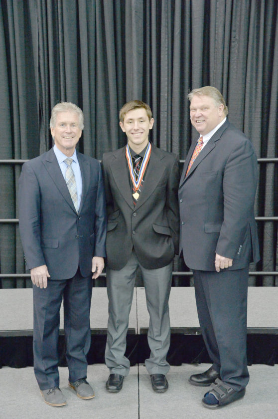 Courtesy photo Seth Polfus, center, of North Central High School is presented with the MHSAA’s Scholar-Athlete Award last weekend by executive director of the MHSAA, John E. Roberts, left, and vice president of marketing for Farm Bureau Insurance, Vic Verchereau, right. Farm Bureau Insurance awarded 32 scholarships to students with a 3.50 or higher grade point average who have previously lettered in at least one sport.