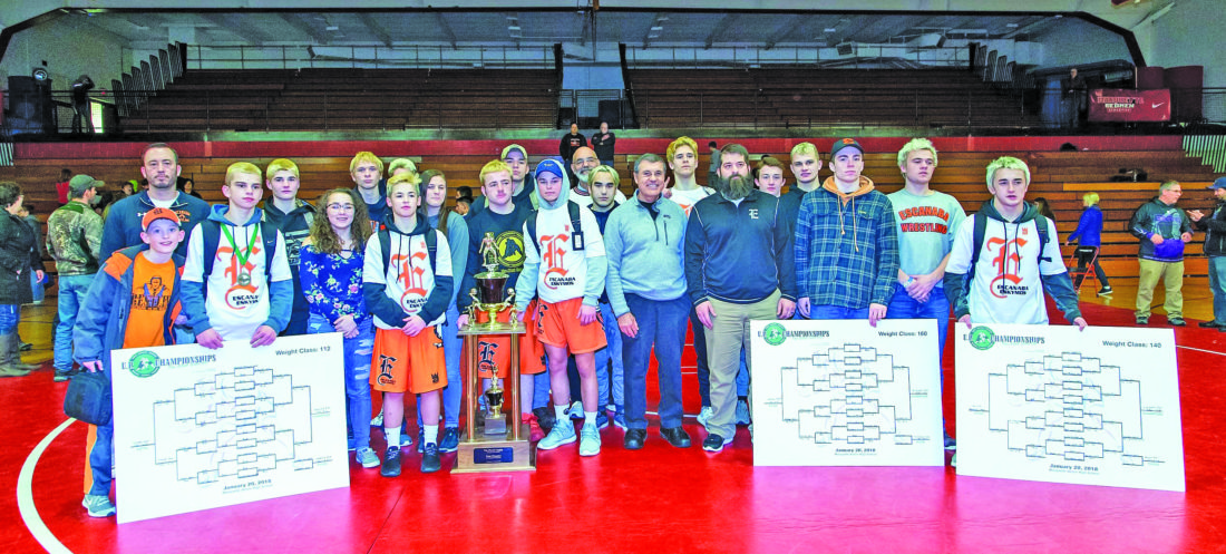 Photo courtesy Daryl T. Jarvinen The Escanaba wrestling team is shown with the first-place trophy after capturing the U.P. championship Saturday at Marquette High School. Earning individual titles for the Eskymos were Brodey Bevins, Scout Wunder and Hunter Larson.