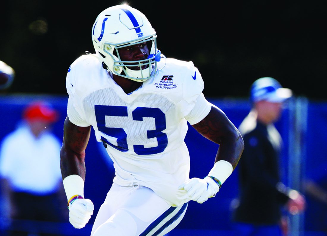 AP file photo In this July 31, 2019, file photo, Indianapolis Colts outside linebacker Darius Leonard runs a drill during practice at the team’s training camp in Westfield, Ind. Leonard works relentlessly at his rural South Carolina home to prepare for another season.