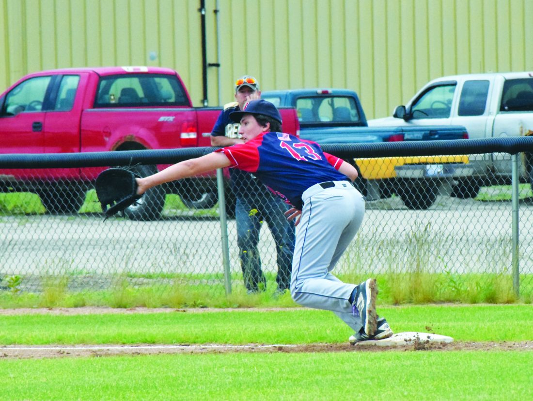 Justin St. Ours | Daily Press Bark River first baseman Max Hall reaches for a throw Sunday against Menominee in Wells.