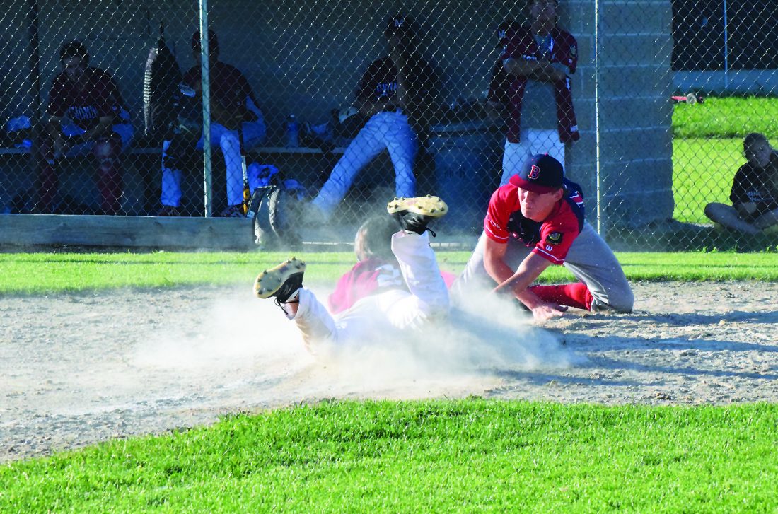 Justin St. Ours | Daily Press Bark River’s Nick Javurek (back) dives across home plate to tag out Menominee’s Ethan Russell (front) Thursday in Bark River.