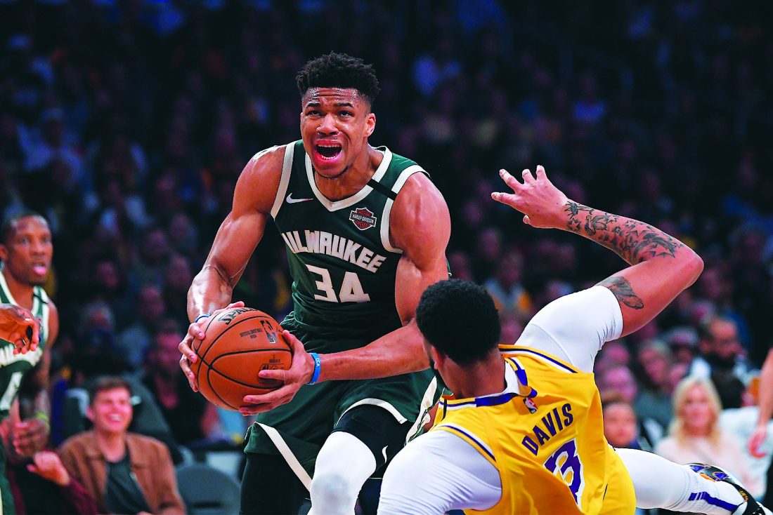 AP photo In this March 6 file photo, Milwaukee Bucks forward Giannis Antetokounmpo knocks down Los Angeles Lakers forward Anthony Davis as he drives to the basket during the first half of an NBA basketball game in Los Angeles.