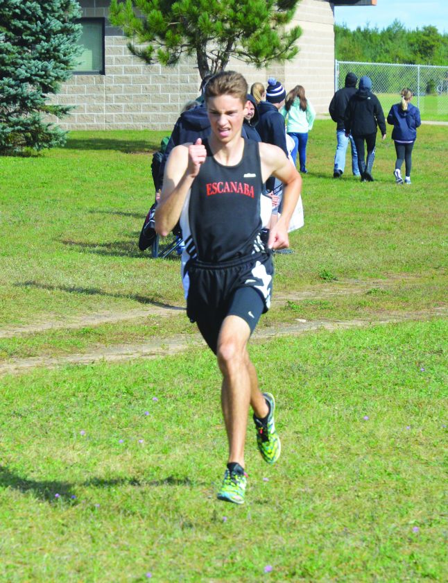 Justin St. Ours | Daily Press Escanaba’s Derek Douglas approaches the finish line Sept. 28, 2019 to take first place for the boys in the Rapid River Invitational at Rapid River.