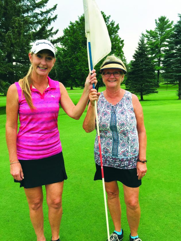 Courtesy photo Nicky Hosking (left) is pictured with Karen Ettenhoffer (right) on the 16th hole of the Highland Golf Club in Hyde Aug. 26.