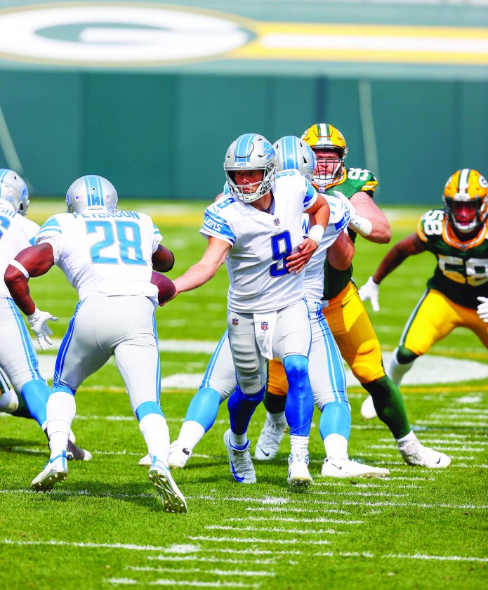 AP photo Detroit Lions’ Matthew Stafford(9) hands off against the Green Bay Packers Sunday in Green Bay, Wis.