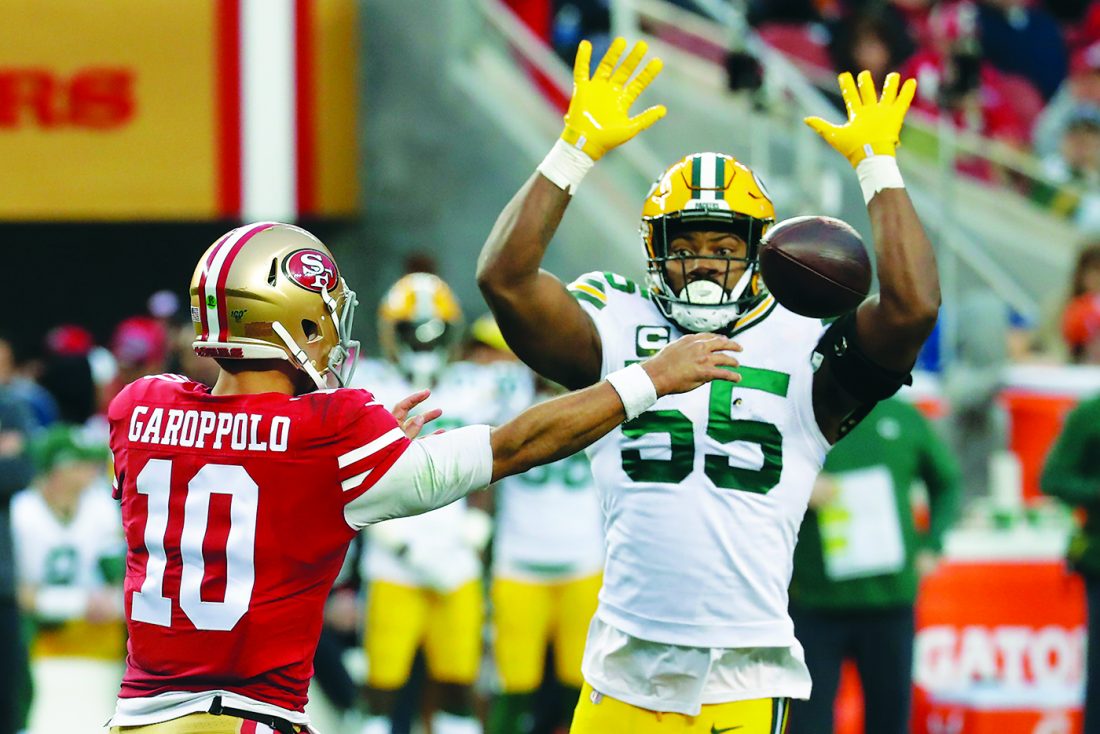 AP photo San Francisco 49ers quarterback Jimmy Garoppolo passes under pressure from Green Bay Packers outside linebacker Za’Darius Smith during the NFC Championship game Jan. 19 in Santa Clara, Calif.