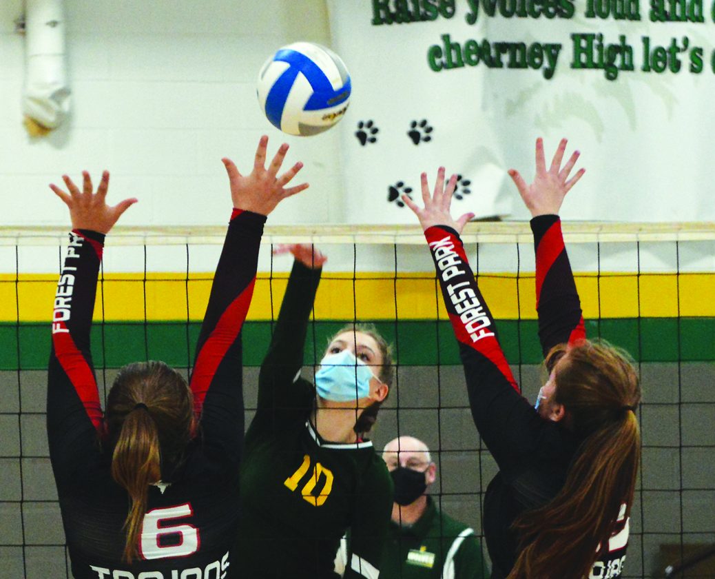 Todd Rose | Daily Press Carney-Nadeau’s Taylor Kedsch (10) hits the ball over the net as Forest Park’s Megan Bucek (6) and Paige Mianecki (15) leap to block Wednesday night in Carney.