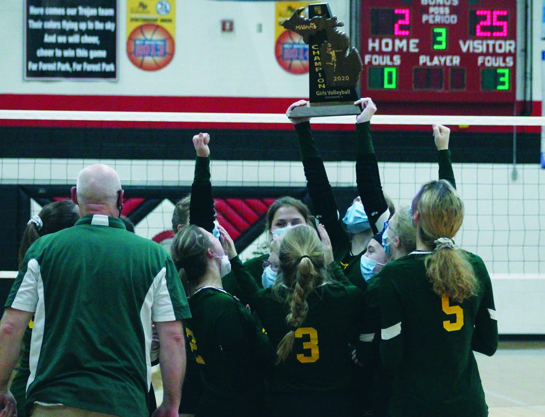 Matt “Sweets” McCarthy | Iron Mountain Daily News Carney-Nadeau's volleyball team celebrates with the MHSAA volleyball Division 4 Region 25 trophy, after defeating Chassell in straight sets Thursday night at the Eddie Chambers Gymnasium at Forest Park High School in Crystal Falls.