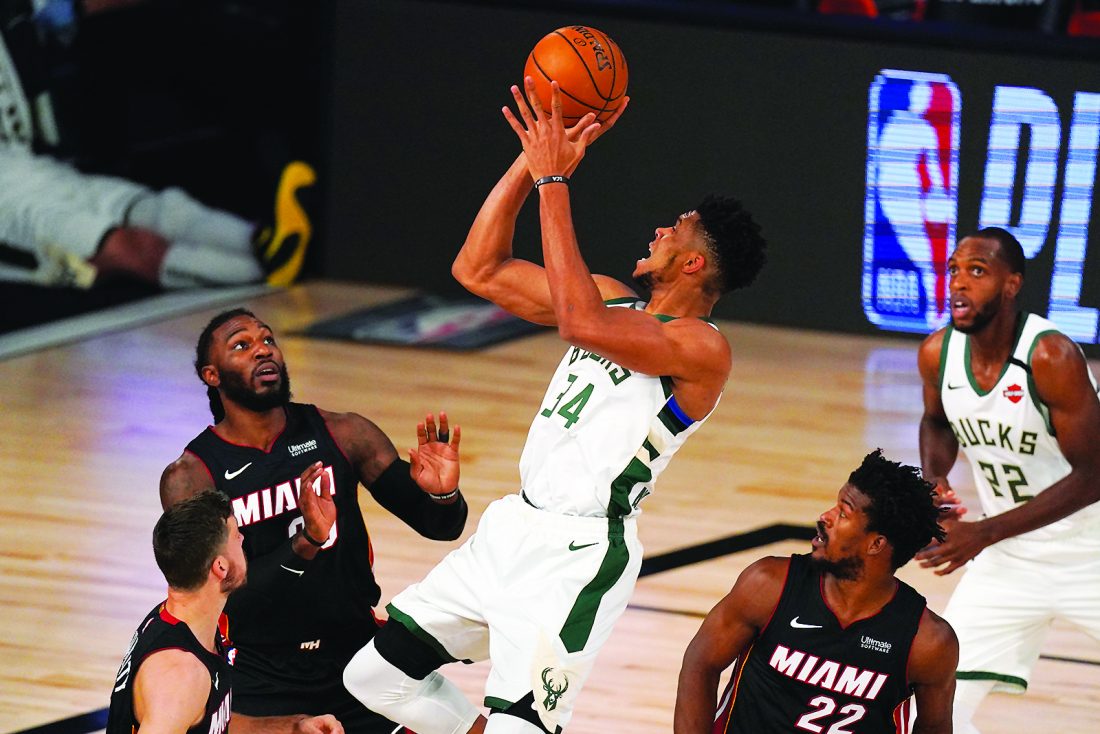 AP photo Miami Heat’s Goran Dragic, bottom left, Jae Crowder, top left, and Jimmy Butler (22) defend as Milwaukee Bucks’ Giannis Antetokounmpo (34) shoots during the a conference semifinal playoff game in Lake Buena Vista, Fla., Aug. 31.