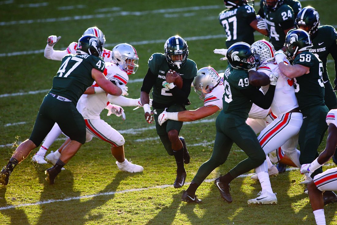 “Those guys fly around and they’ve got a good pressure package,” Michigan State coach Mel Tucker said. “They seem to be able to play to the strength of their players, and they’re able to mix some coverages and things like that and they seem to be growing and getting better.”
