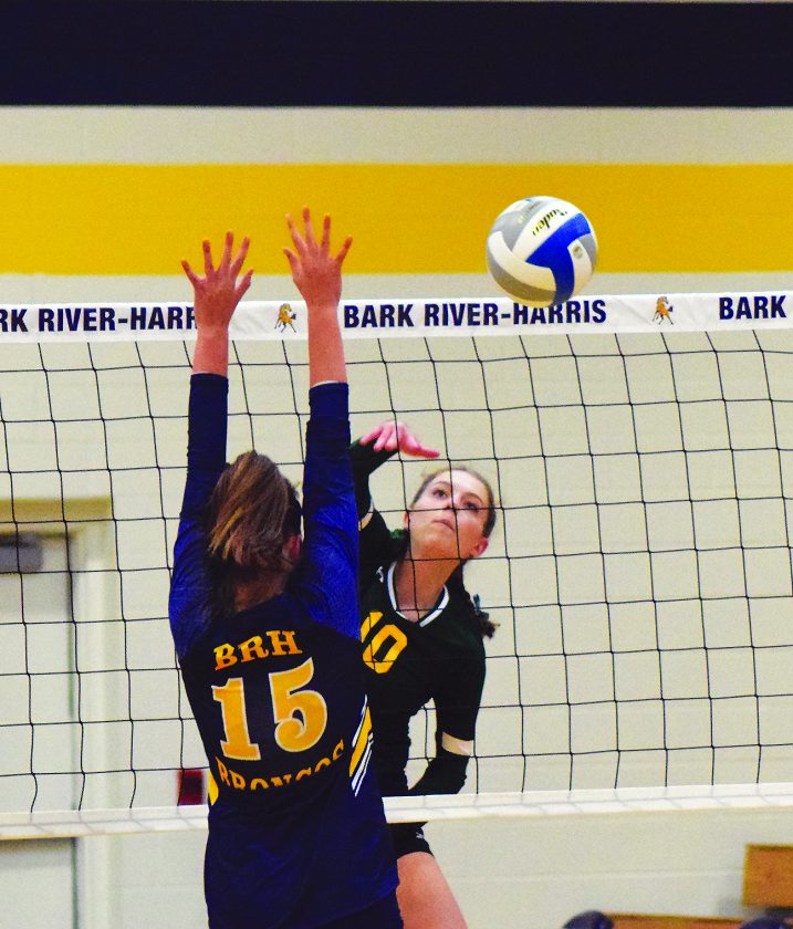 Justin St. Ours | Daily Press Carney-Nadeau’s Taylor Kedsch (10) spikes the ball against Bark River-Harris’ Carley Varoni (15) Sept 1. at Bark River.