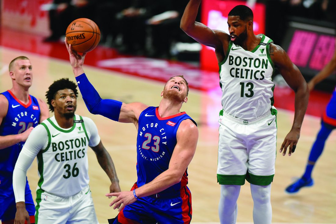 AP photo Detroit Pistons forward Blake Griffin, left, throws up a shot over Boston Celtics forward Tristan Thompson Sunday in Detroit.