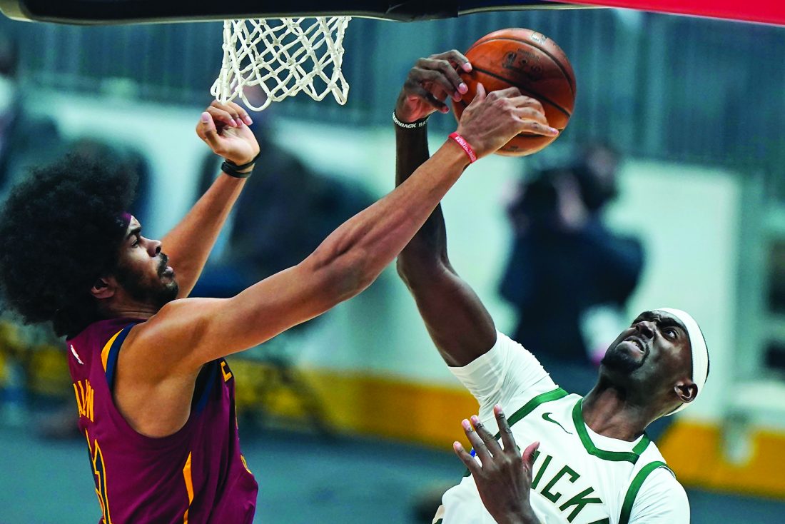 AP photo Milwaukee Bucks’ Bobby Portis, right, and Cleveland Cavaliers’ Jarrett Allen battle for the ball Friday in Cleveland.