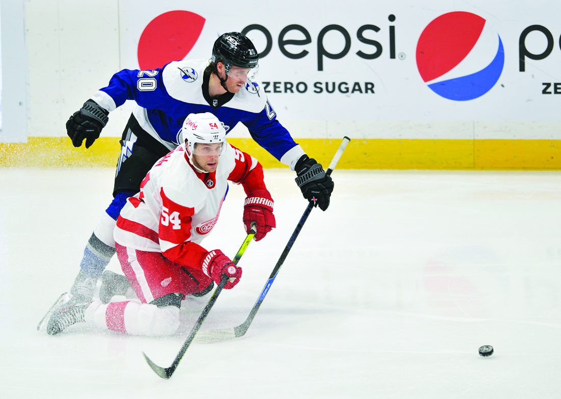 AP photo Detroit Red Wings’ Bobby Ryan (54) clears the puck away from Tampa Bay Lightning’s Blake Coleman (20) Friday in Tampa, Fla.