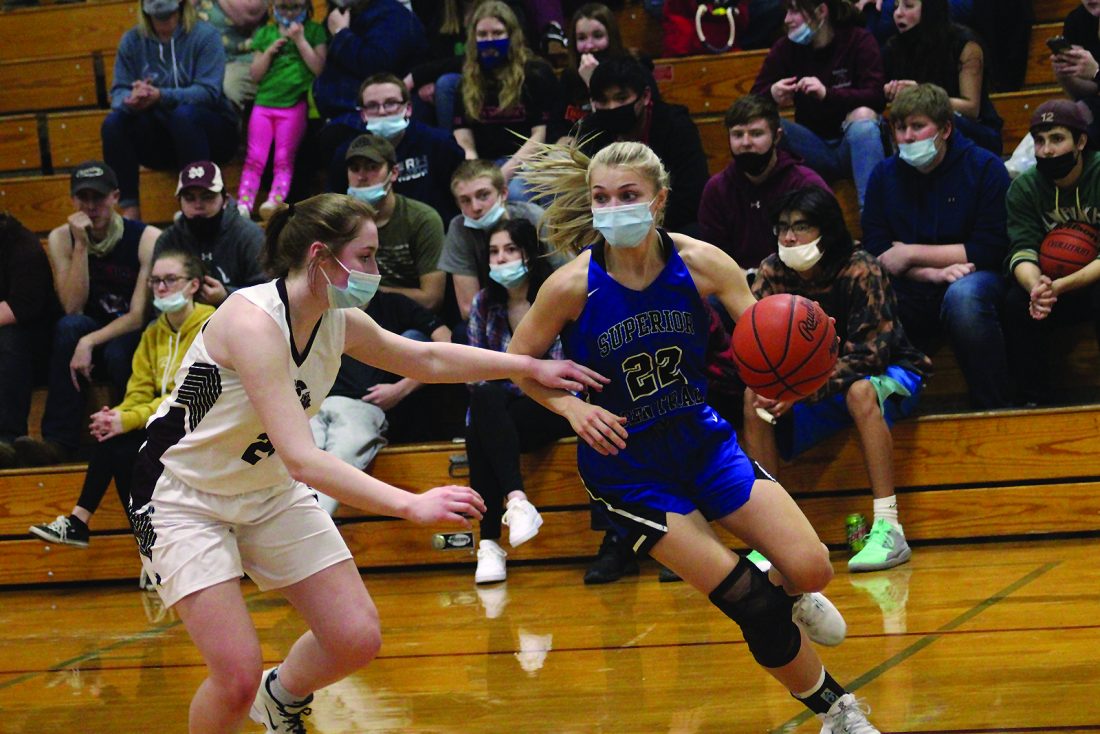 Matt McCarthy | Iron Mountain Daily News photo Superior Central junior Riley Johnson (22) dribbles out of the corner, as North Dickinson's Micah Lindholm defends, in a Skyline Central Conference girls basketball game Monday night at the Carl F. Lemin Jr. Gymnasium in Felch.