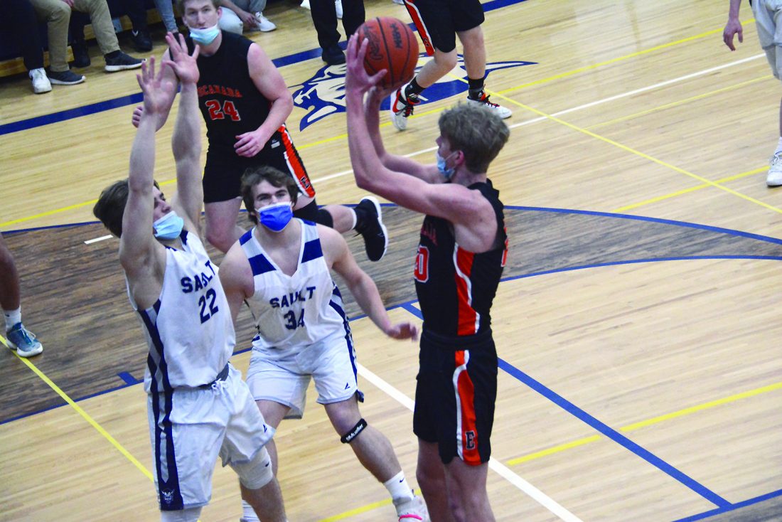 Rob Roos | Sault Evening News Escanaba’s Colin Hudson (20) puts up a shot over Sault Ste. Marie defenders Vinnie Febles (22) and Ryan LaPlaunt (34) during a basketball game Friday night. The Eskymos downed the Blue Devils 66-24 in the non-conference matchup in Sault Ste. Marie.