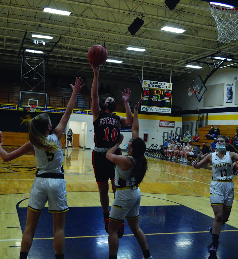 Todd Rose | Daily Press Escanaba’s Maddy Monkevich (10) shoots over Bark River-Harris’ Allison Richer (center bottom) and BR-H’s Alaska Peterson (5) Friday at Bark River. Looking on for the Broncos is Cara Zawacki (13).