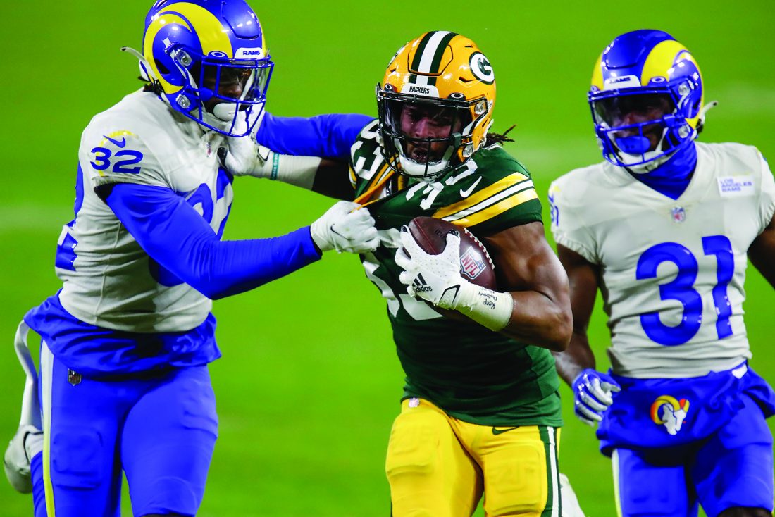AP photo This Jan. 16 file photo shows Green Bay Packers’ Aaron Jones (33) being chased down by Los Angeles Rams’ Jordan Fuller (32) and Rams’ Darious Williams during a divisional playoff game in Green Bay, Wis.