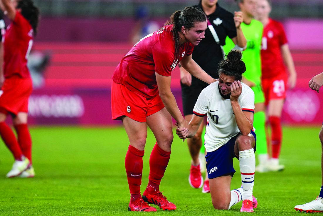 AP photo Canada’s Vanessa Gilles, left, comforts United States’ Carli Lloyd after a women’s semifinal at the 2020 Summer Olympics, Monday in Kashima, Japan.
