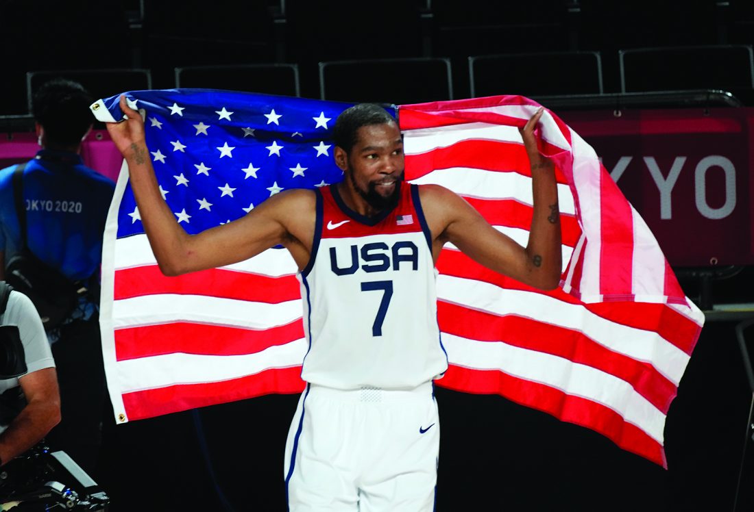 AP photo United States’ Kevin Durant (7) celebrates after their win in the men’s basketball gold medal game against France at the 2020 Summer Olympics, Saturday in Saitama, Japan.